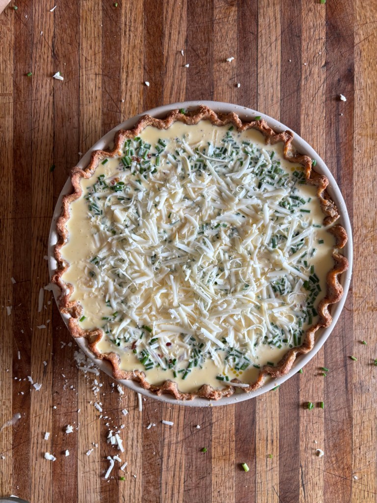 While that’s par baking, shred your cheese and mix up your eggs. I mix the eggs, whipping cream, salt & pepper together. Sometimes I add a dash of mustard powder.